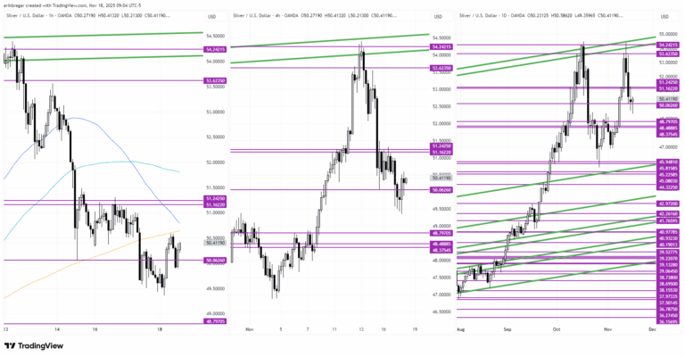 A nerve-racking Asian session for the precious metal bulls last night because gold & silver quickly gave up their bounces above Friday’s lows, and Chinese demand did not show up. The stopping out of a few thousand more gold long positions below yesterday’s lows around 2:30amET, and a bounce for the S&P futures and Bitcoin to finish that hour, then helped the precious metals recover into the NY open. Broad USD / US yield weakness following this morning’s latest ADP employment report (showing the US shed another 2500 jobs / week in the four weeks ending Nov 1) is now helping gold burst above its COMEX opening range and the overnight high + decouple from equity / crypto volatility. December rate cut odds have risen from 40% back to 50%. This is a good sign for the bulls. Hopefully the Fed’s Barr & Barkin don’t screw things up when they speak today.