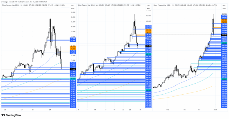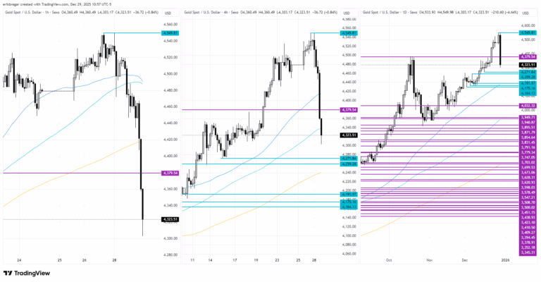 Some absolutely wild post-Christmas trading activity for the precious metals. First, silver and platinum’s incredible +10% rallies on Friday, fueled by an odd rehashing of the China silver export restriction story from October and rumors that a bullion bank was blown out of its silver short position; and now scary -16% & -18% crashes off session highs for the white metals following two distinct slams overnight during the very illiquid 7pmET & 1amET hours, and following this morning’s breakdown below the COMEX opening ranges. There haven’t been any headline triggers or narratives behind the plunge, and there’s hasn’t been an abrupt negative turn in broader risk sentiment, and so this feels eerily familiar to how the bank-engineered slam from Oct 21 unfolded (Europe creates the panic, Western accounts try to buy-the-dip but then give up). As usual, safe-haven gold is getting unfairly taken out with the bathwater here, and the fact that it has now given up last Monday’s breakout above the October highs is a discouraging sign technically. Unless we miraculously regain this level by the NY close today, unfortunately I think we have just witnessed another short-term market top.